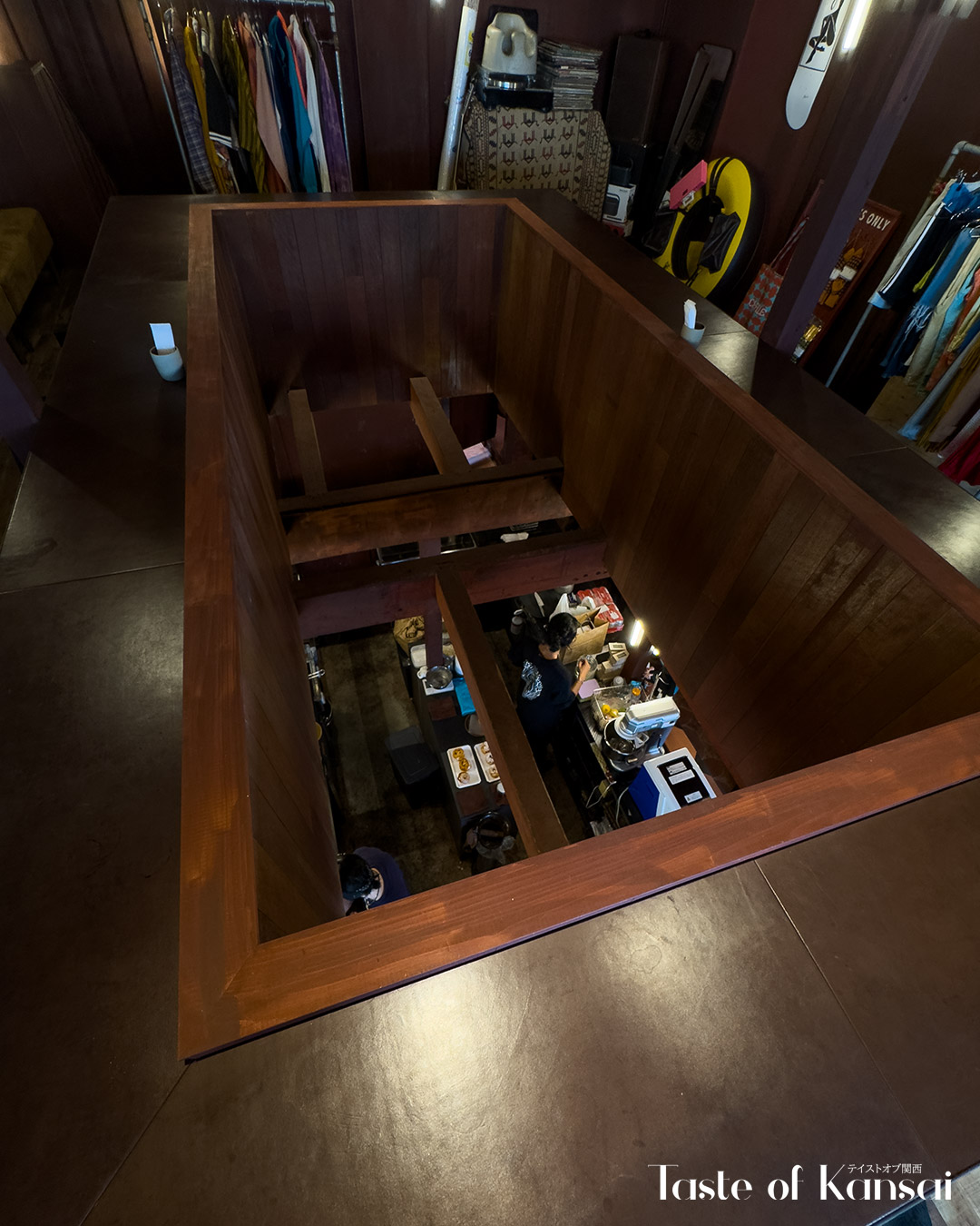 At the back, stairs lead to the second-floor seating area, where guests can sit around a large atrium that opens directly above the kitchen and also functions as a counter-style seating zone. The café was designed by UNC Studio, an award-winning firm recognized by Dezeen, Design Anthology, and Frame.