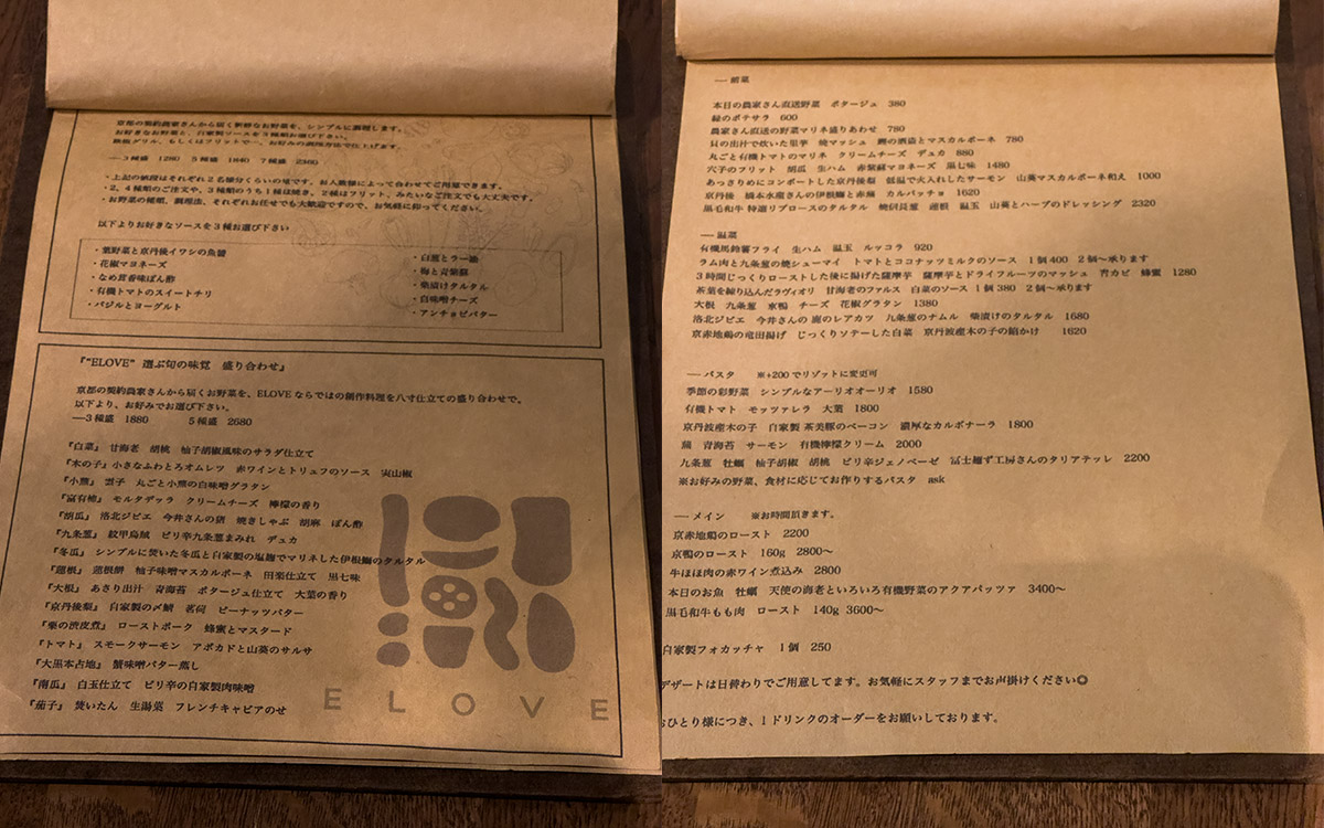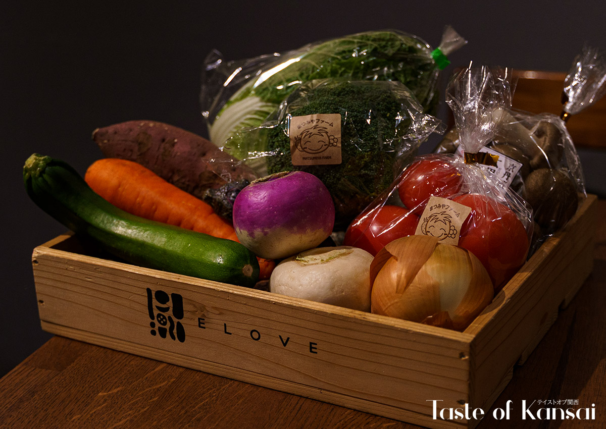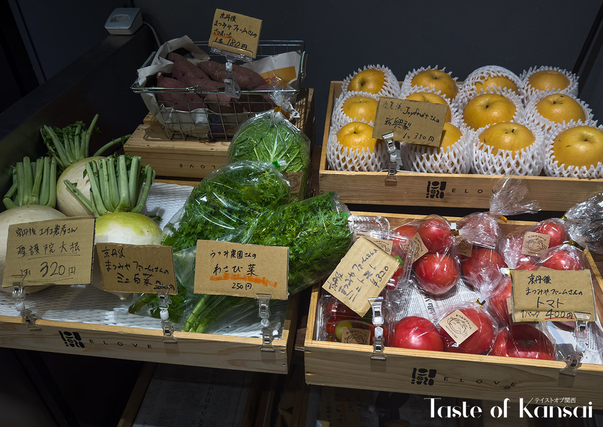 ELOVE is a vegetable-focused Italian diner and deli that opened on September 18, 2021, in Kyoto’s central Karasuma area, positioning itself as a complex restaurant that connects guests with the passion of local producers and their ingredients. Located roughly a one-minute walk from Hankyu Karasuma Station and close to Shijo Station, highly accessible within the busy Shijo–Karasuma business and shopping district. The name emphasizes a concept of “loving” vegetables and food, as well as wordplay of "Erabu" (meaning choose) in Japanese which is part of the menu where guests can select from a box of vegetables for dinner, thus letting guests experience the full appeal of carefully grown produce through Italian cooking and an adjoining delicatessen offering.