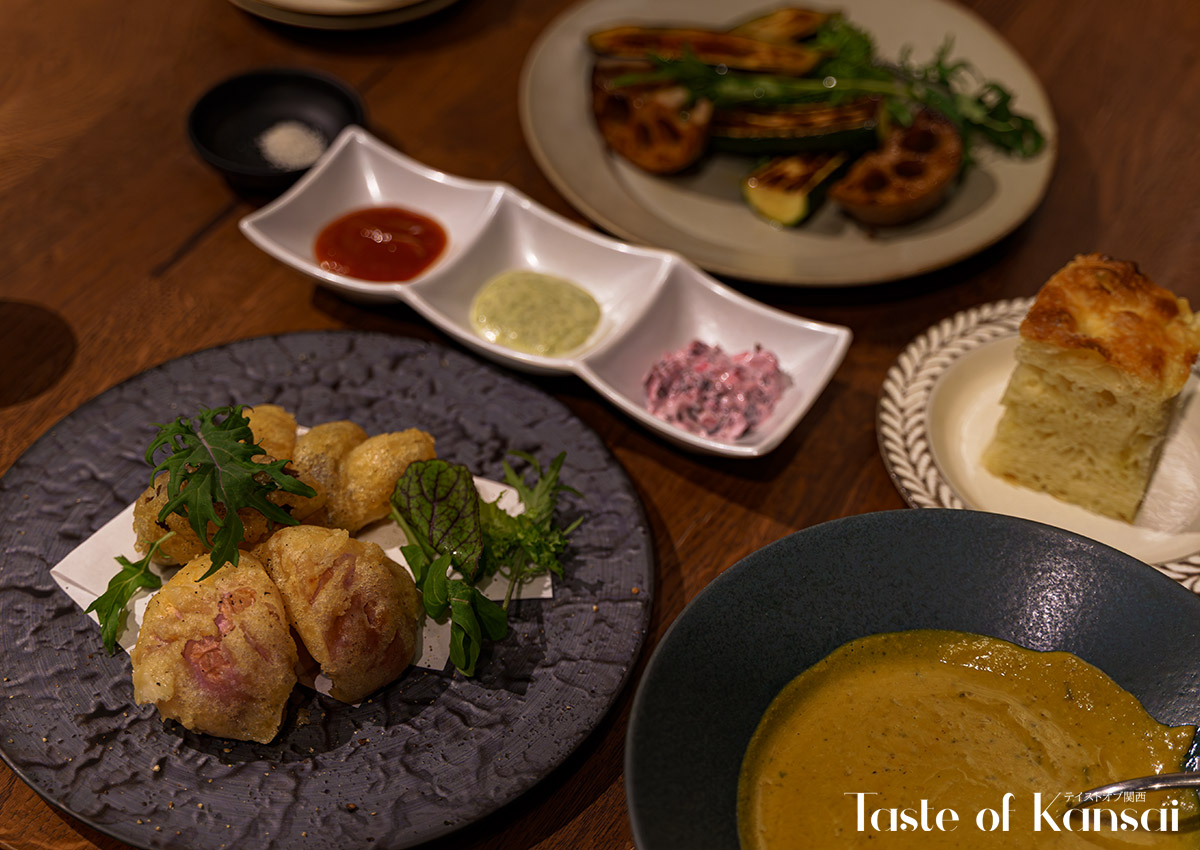 The menu centers on set courses for both lunch and dinner, with the kitchen composing dishes daily around the seasonal vegetables arriving that morning, resulting in lineups that can change frequently rather than adhering to a fixed à la carte structure. At lunch, guests encounter compositions built from around twenty kinds of vegetables, often paired with items such as domestic beef hamburg steak or carefully selected brand meats, while dinner shifts toward fuller Italian courses that place vegetable-led antipasti, mains, and pastas alongside meat and fish prepared with the same producer-focused philosophy. The beverage program is built around wine and other drinks intended to complement a vegetable-forward Italian meal, and the on-site deli and retail counter expand the experience with prepared side dishes and take-home vegetables that echo the flavors of the dining room.