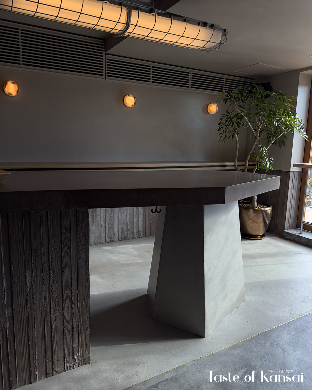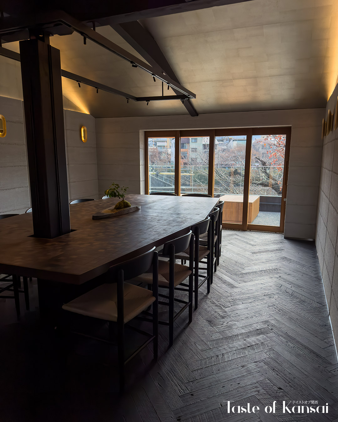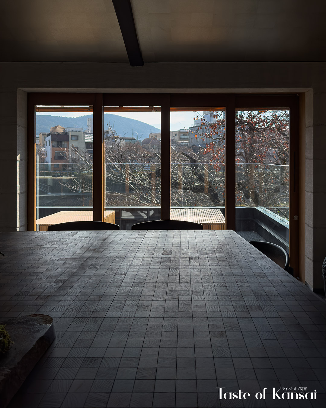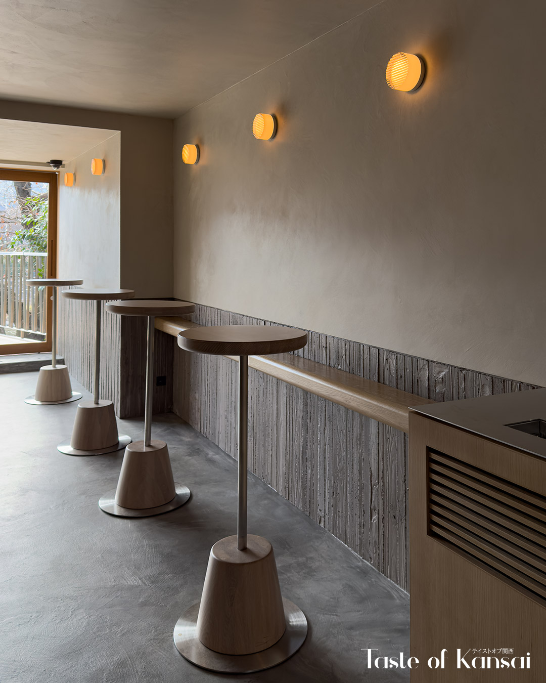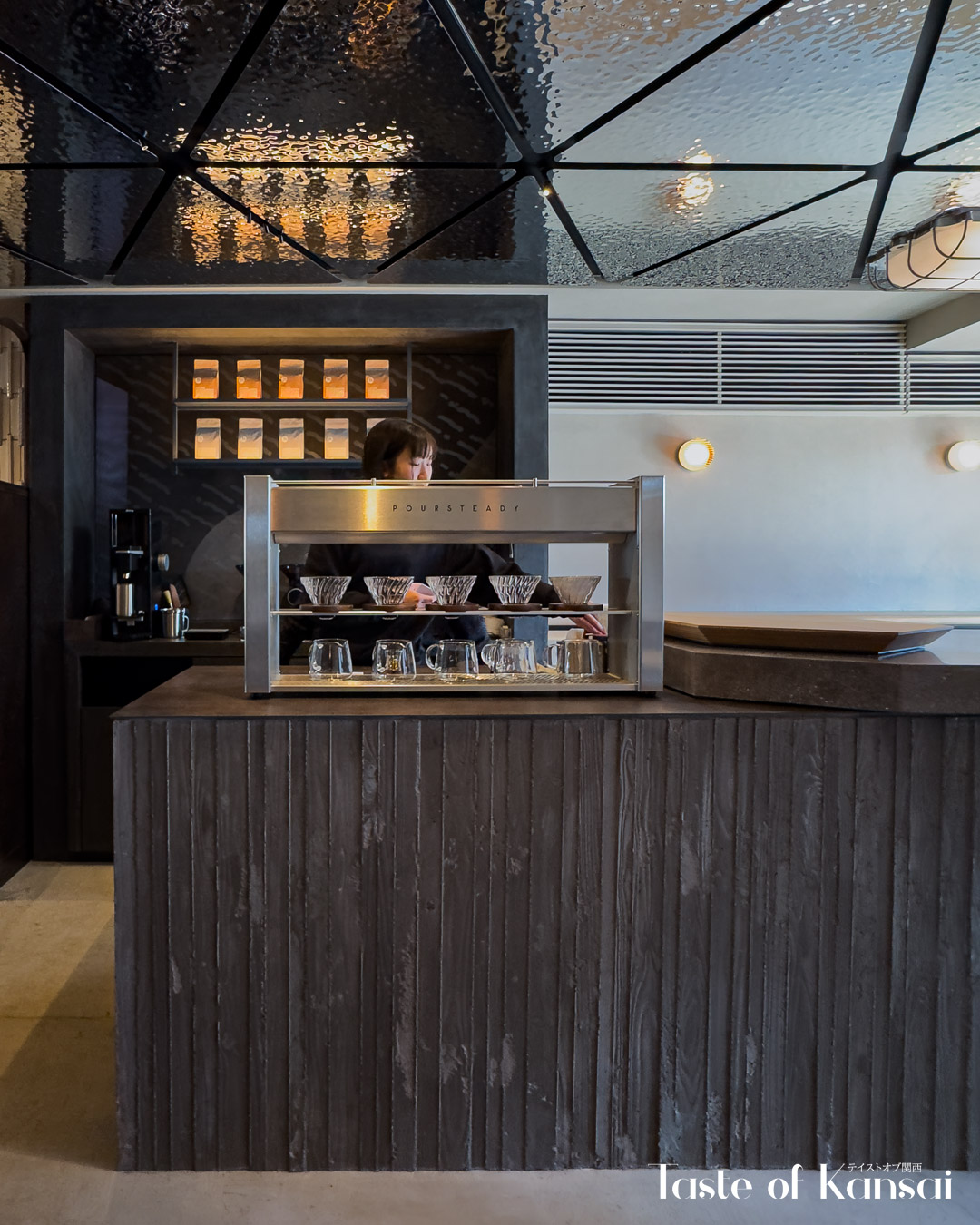 The café is housed in a traditional renovated Kyoto townhouse (kyomachiya), featuring a refined black exterior. Large glass-panel demado (bay window) and a glass door entrance on the ground floor offer clear views into the interior, while a traditional koushi demado baywindow sits on the second floor. Inside you will find a narrow deep interior that opens toward the Kamo River. The cafe spans two floors, with a sleek, contemporary interior focused on clean lines, muted tones, and natural light. The café is arranged across two levels, each with terrace seating and river views, and filled with natural light from large, river-facing windows. The first floor is a standing-only space centered around the bar, allowing customers to experience the brewing process up close. Upstairs, the second floor offers a more relaxed setting with a communal table and terrace seating where guests can sit and linger.