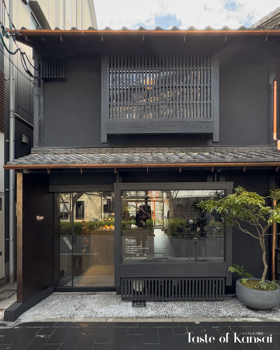 Flow by Nozy Coffee (instagram.com/flow_by_nozycoffee) is a stylish cafe that opened in January, 2026, as the first Kyoto outpost of the Tokyo-based specialty roaster NOZY COFFEE, positioned just a short walk from both Gion-Shijo Station on the Keihan Line and Kyoto-Kawaramachi Station on the Hankyu Line. Set along the Kamo River where it meets the historic Takase River, the cafe’s name “flow” reflects the continuous movement of water and seasonal changes in the surrounding landscape, a concept the brand ties to the experience of spending time in the shop. Customers arriving from the busy Shijo-Kawaramachi area encounter a setting that transitions from the bustle of central Kyoto to a calmer riverside environment, positioning the cafe as a bridge between the city’s commercial core and its more contemplative riverfront.