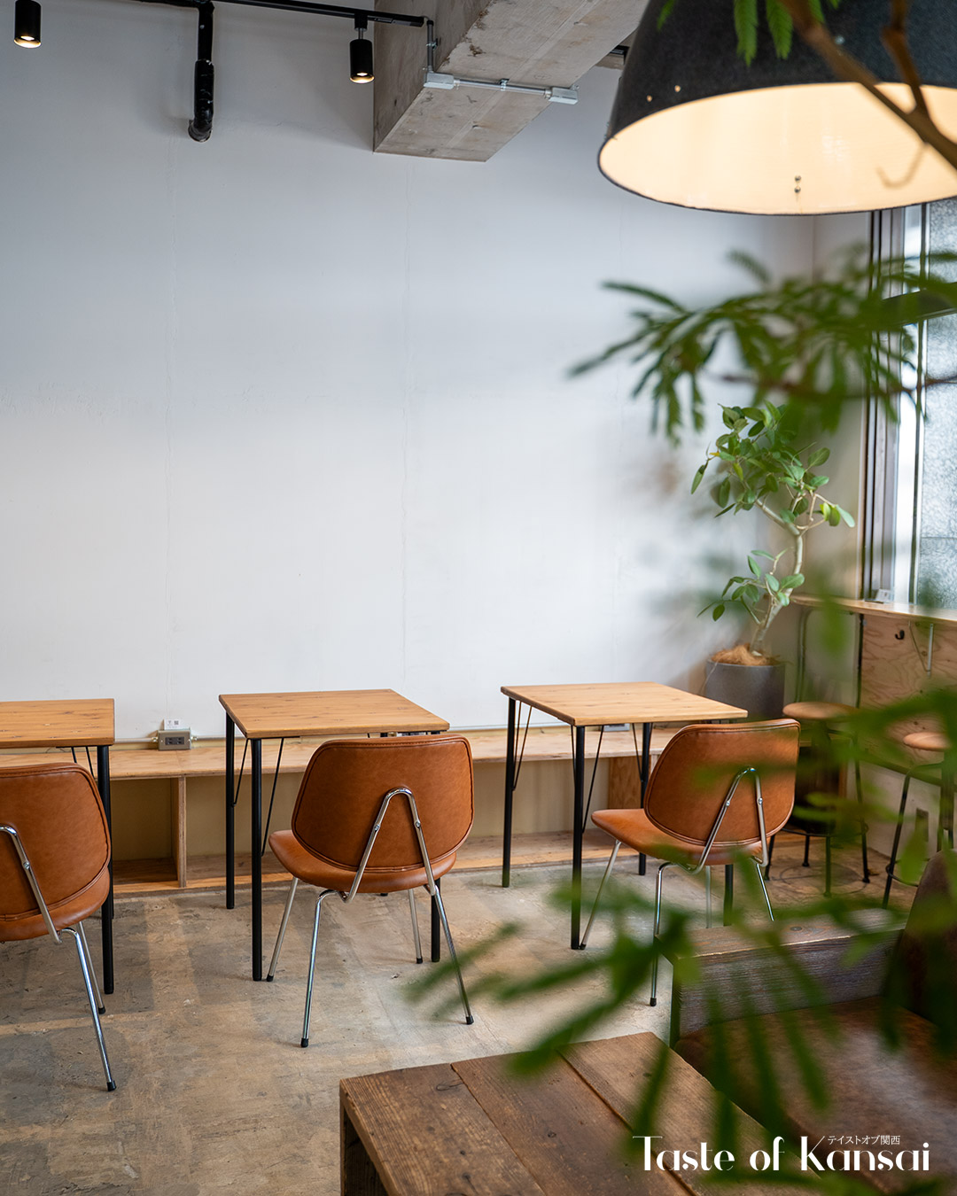 店内は、温かみのある木材と控えめな家具が調和し、落ち着いた居心地の良い雰囲気になっており、仕事にもプライベートにもゆったりとくつろげる空間です。自然光とさりげない緑が、近隣の喧騒から離れた静かなひとときを演出します。