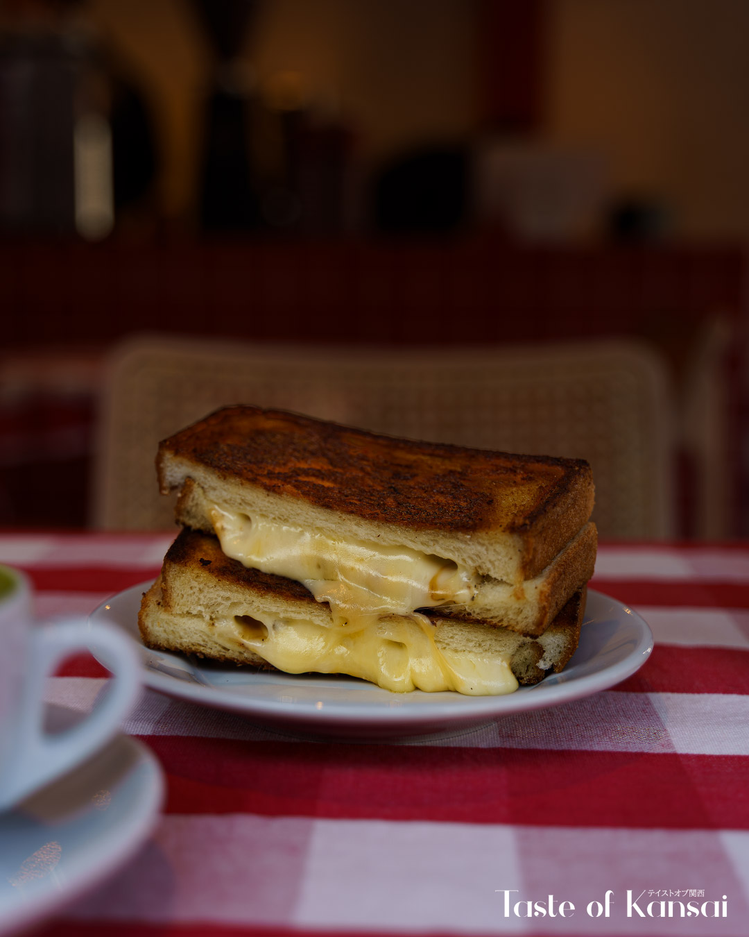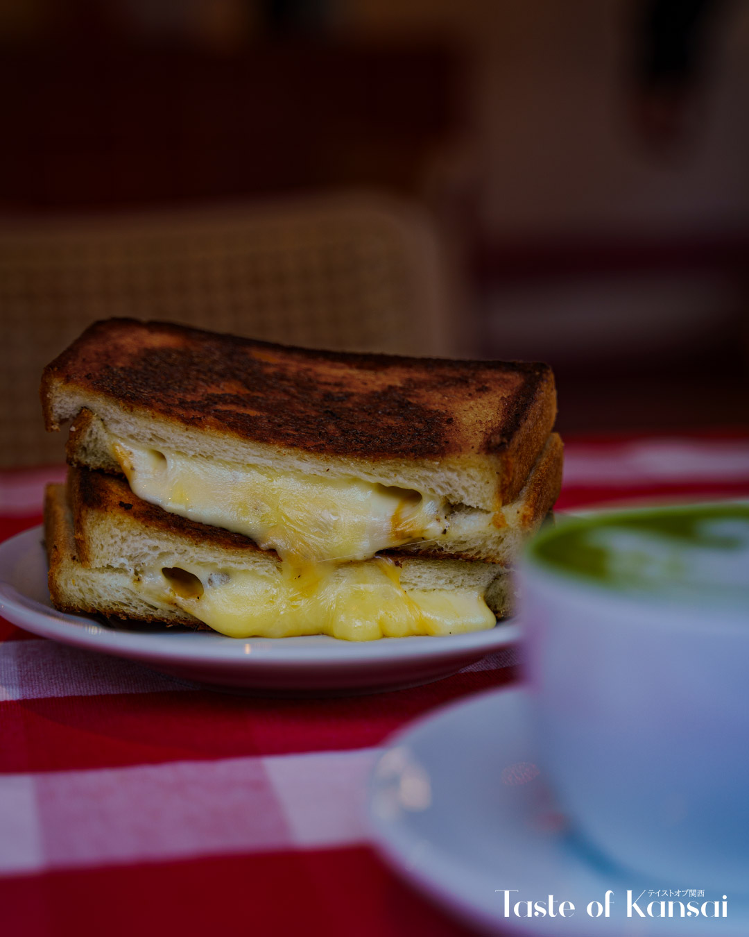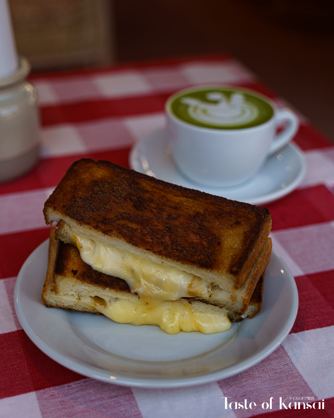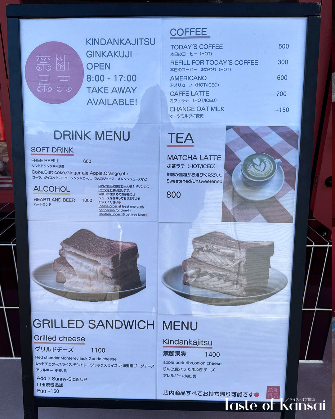 Of course, the real draw is the food. The menu at Kindan Kajitsu Ginkaku-ji focuses on simple café drinks and hearty grilled sandwiches. Coffee options include Today’s Coffee, Americano, and Caffè Latte, with the option to switch to oat milk, while tea drinkers can choose a Matcha Latte served hot or iced. Soft drinks such as cola, ginger ale, apple juice, and orange juice are available with free refills, and there is also a Heartland beer for those wanting something alcoholic. For food, the café offers grilled sandwiches like a classic grilled cheese made with red cheddar, Monterey Jack, and gouda, as well as the house “Kindankajitsu” sandwich that pairs apple with pork ribs, onion, and cheese, reflecting the café’s signature theme.