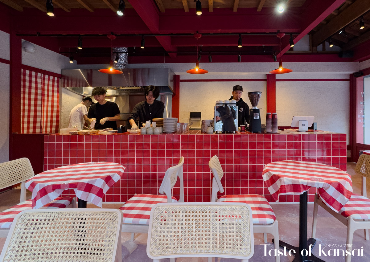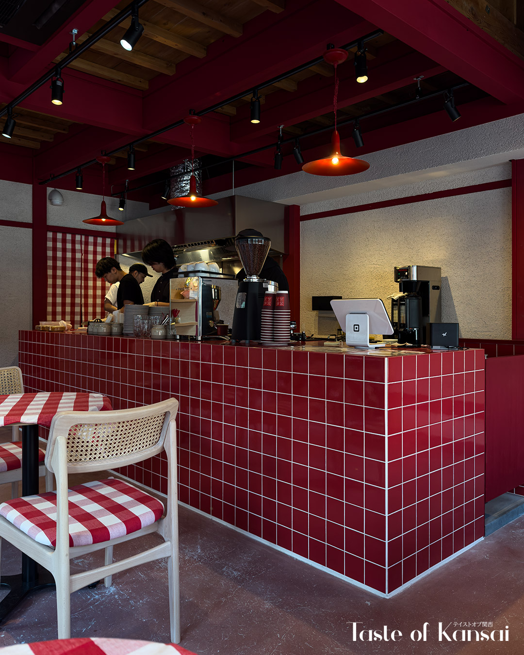The interior of Kindan Kajitsu Ginkaku-ji is bright and lively, centered around a bold red design theme. A open counter clad in glossy red tiles runs along the kitchen, where guests can see staff preparing food and drinks, while red ceiling beams, warm pendant lights, and black track lighting add depth overhead. Small café tables dressed in red-and-white gingham tablecloths and light wood chairs with woven cane backs give the space a relaxed, slightly retro café feel. Because the front and side walls are lined with large windows, plenty of natural light pours into the room, reflecting off the red tiles and white walls and keeping the space airy and welcoming.
