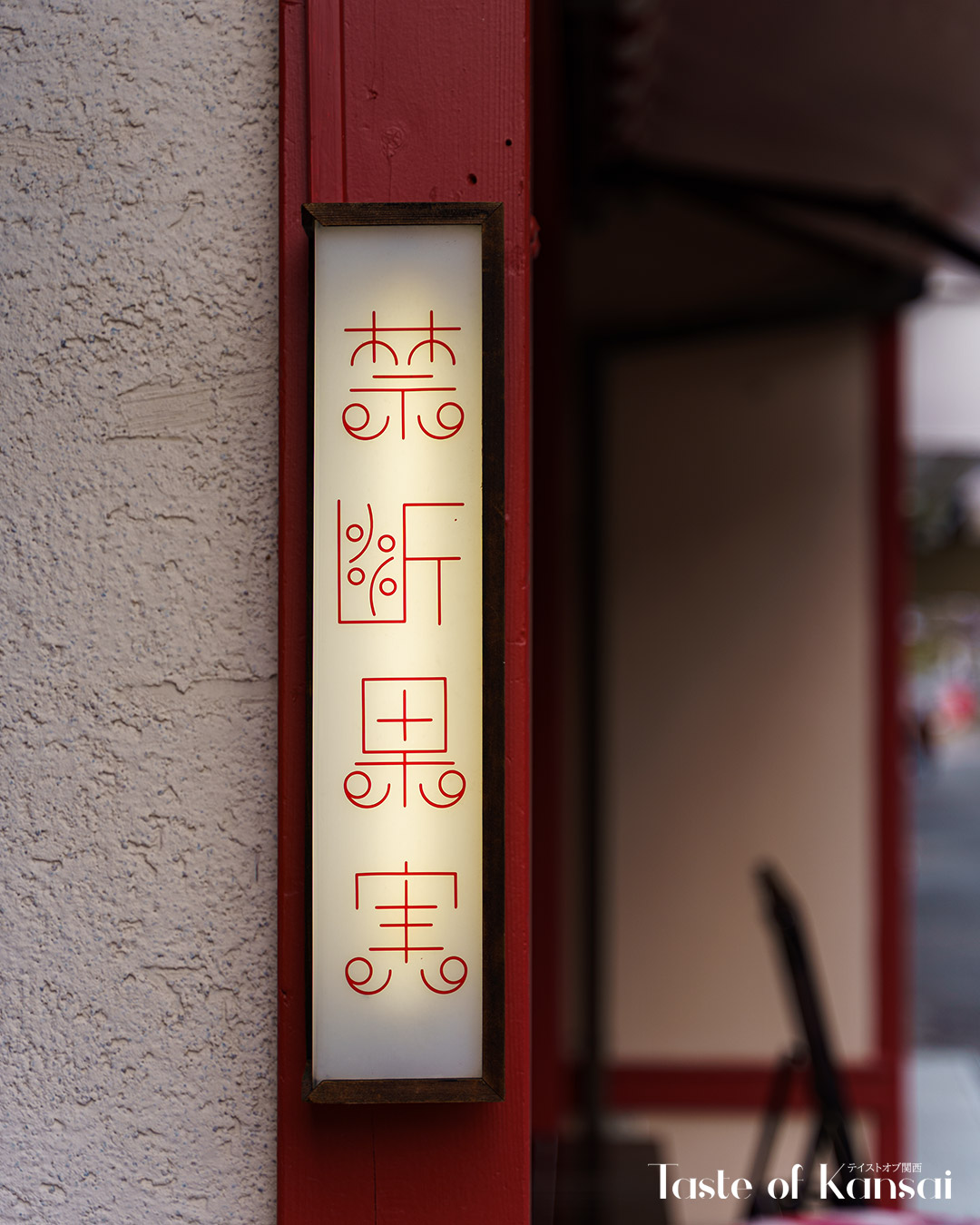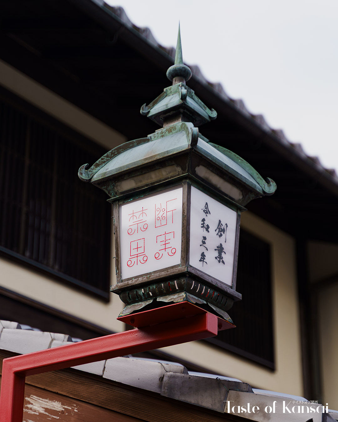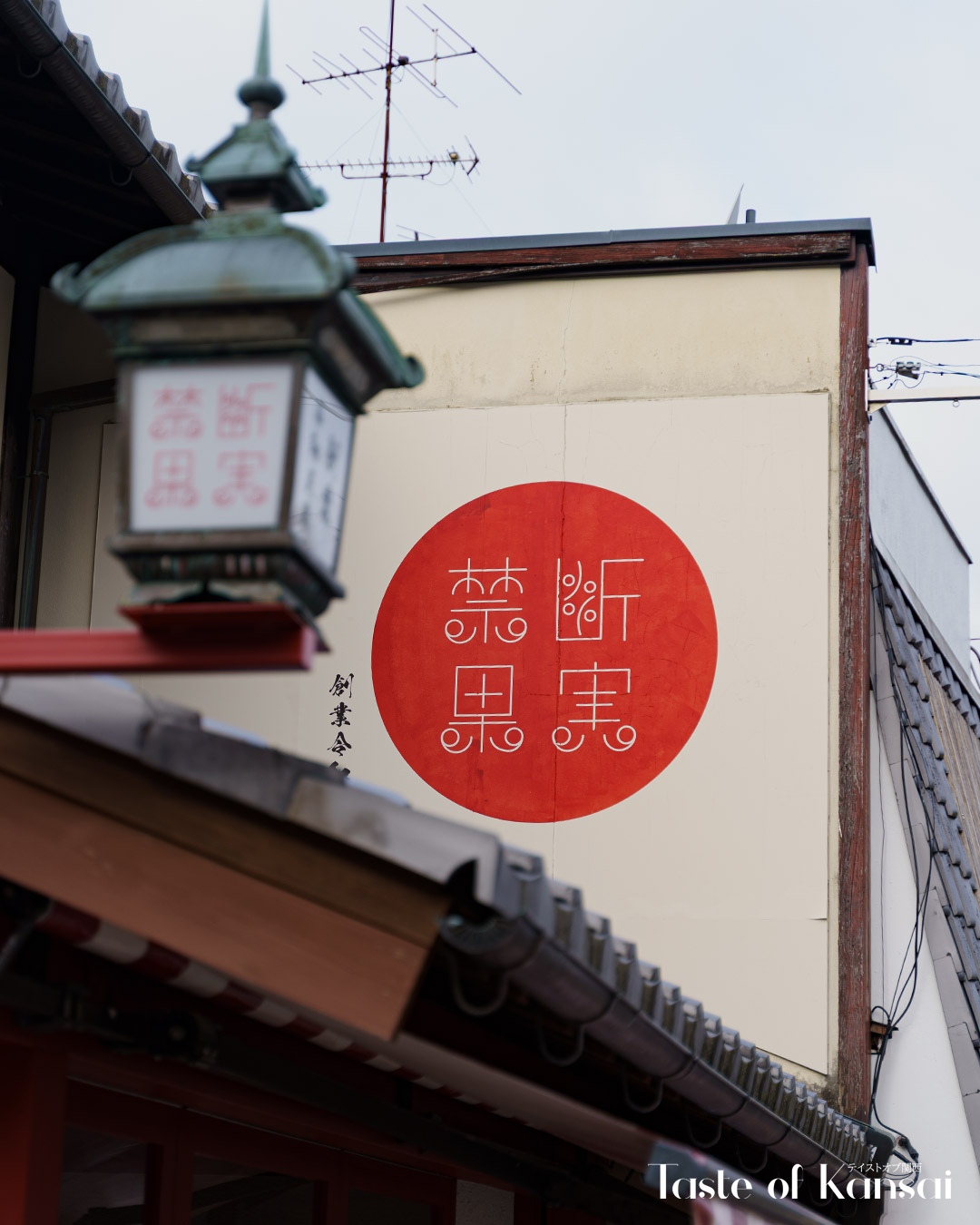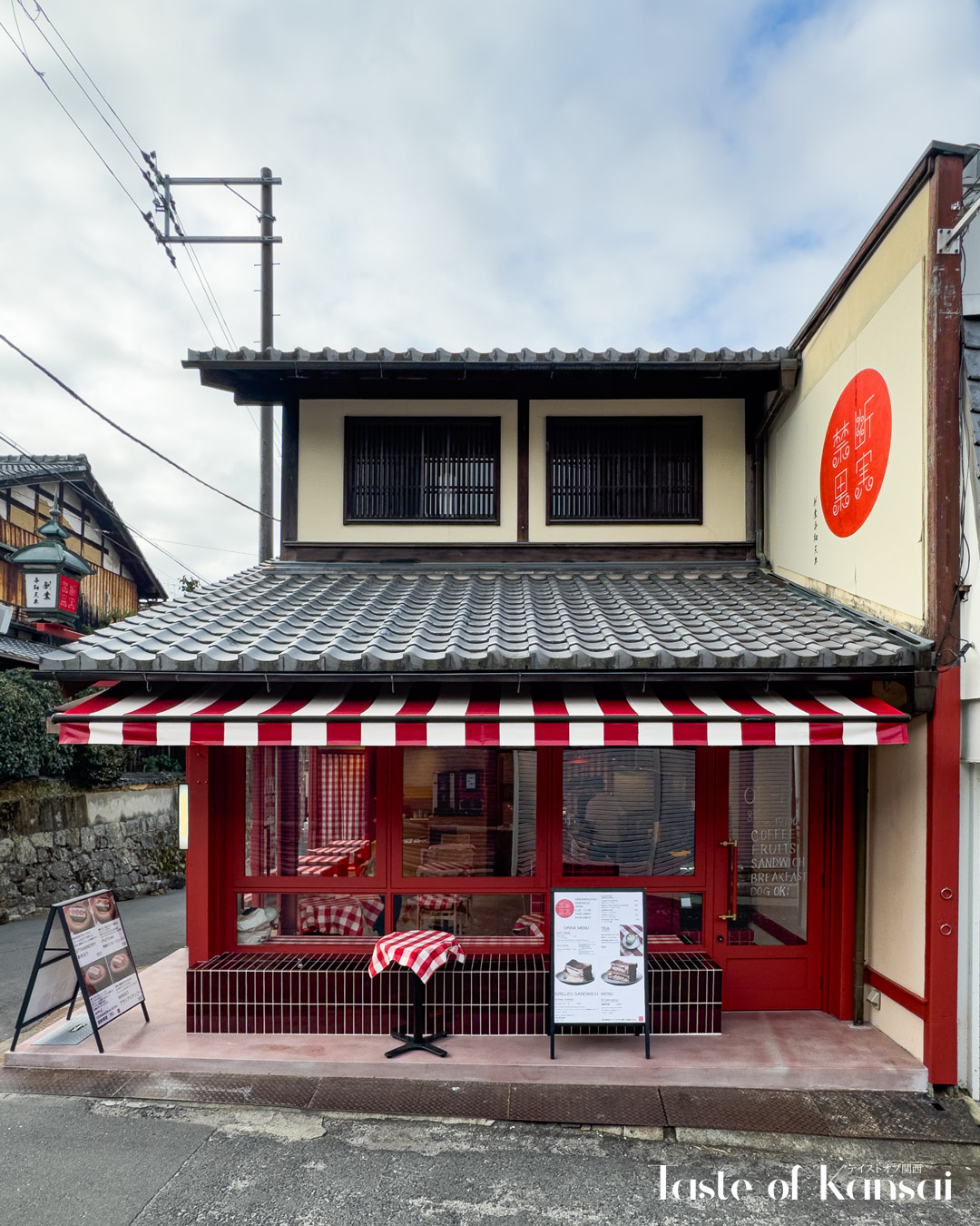 From the outside, the shop stands out as a charming old Kyoto townhouse fitted with a bright red-and-white striped awning, giving it the feel of a classic retro café tucked into a historic neighborhood street.