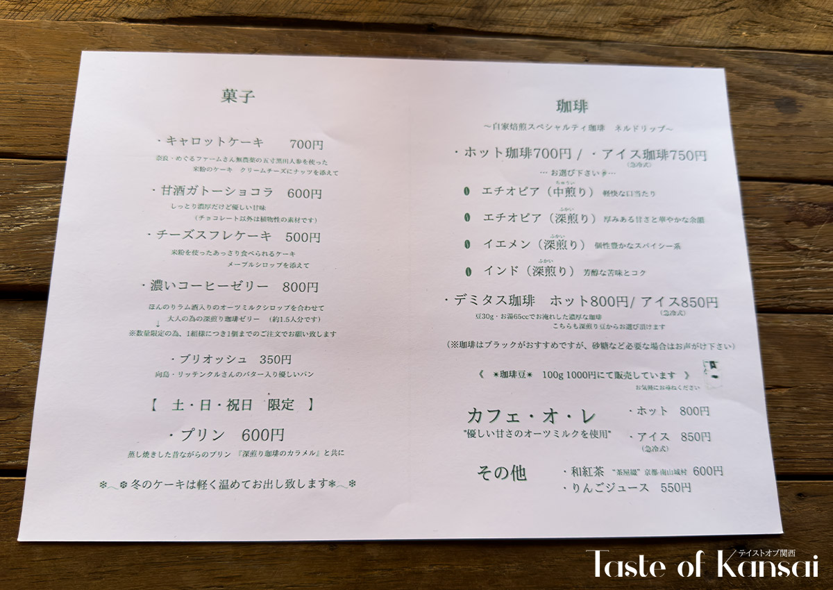 The menu revolves around this carefully prepared coffee and a short selection of house-made sweets. Most of the desserts are vegan, made without eggs or dairy, and change with the lunar cycle. Around four seasonal or event-based items are offered at a time, with new selections introduced at each new moon using ingredients that reflect the season. This approach gives regular visitors something new to look forward to while keeping the menu closely tied to the surrounding agricultural landscape.