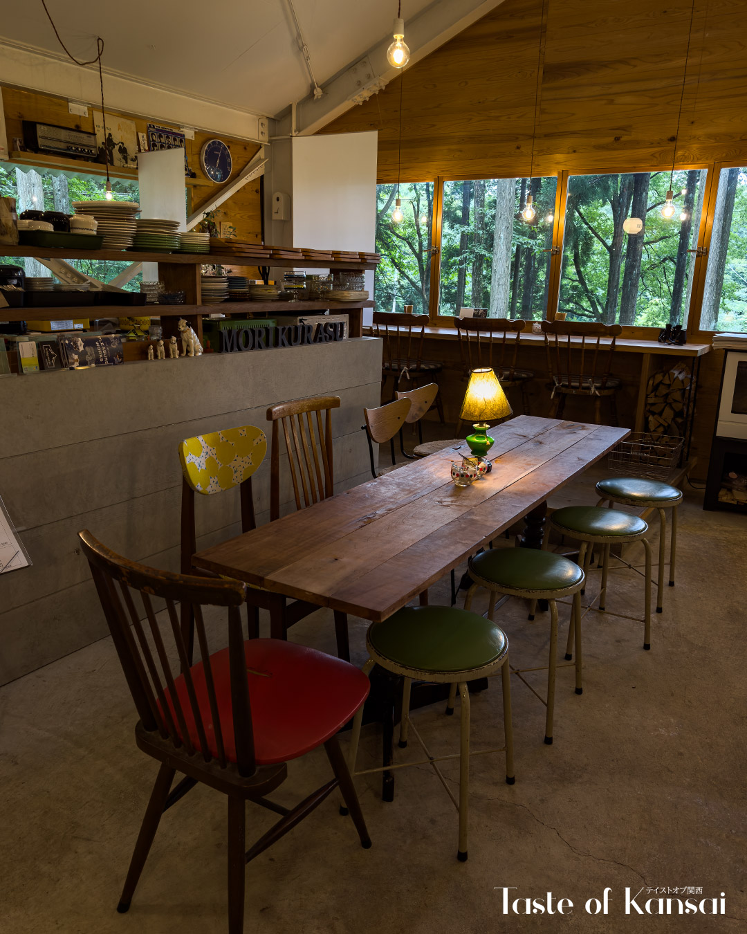 Located in the scenic Hiruzen Highlands of Maniwa, Okayama, Morikurasu opened in 2018 as a relaxing retreat amid lush greenery and wide-open fields. The café is about a 20-minute drive from Chugoku-Katsuyama Station, making it accessible by car for visitors exploring the Hiruzen area. The name “Morikurasu” combines the Japanese words mori (forest) and kurasu (to live), reflecting the café’s concept of living in harmony with nature. The building blends naturally with its environment, constructed primarily of wood with large windows that invite in natural light and views of the surrounding forest and mountains.