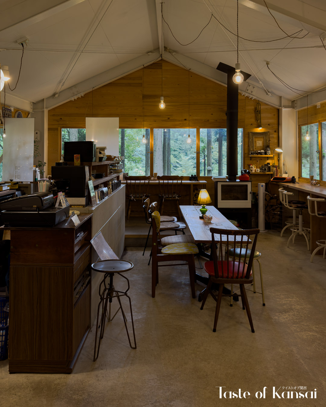 Inside, the space is designed with a simple, Scandinavian-inspired aesthetic featuring natural timber, clean lines, and neutral tones that enhance the serene rural atmosphere. The open-plan layout includes communal tables and counter seating that overlook the landscape, while the exterior resembles a modern wooden cabin surrounded by greenery. The main attraction for visitors is its seamless integration with the natural environment, an ideal stop for travelers seeking a tranquil pause during sightseeing or outdoor activities in Hiruzen.