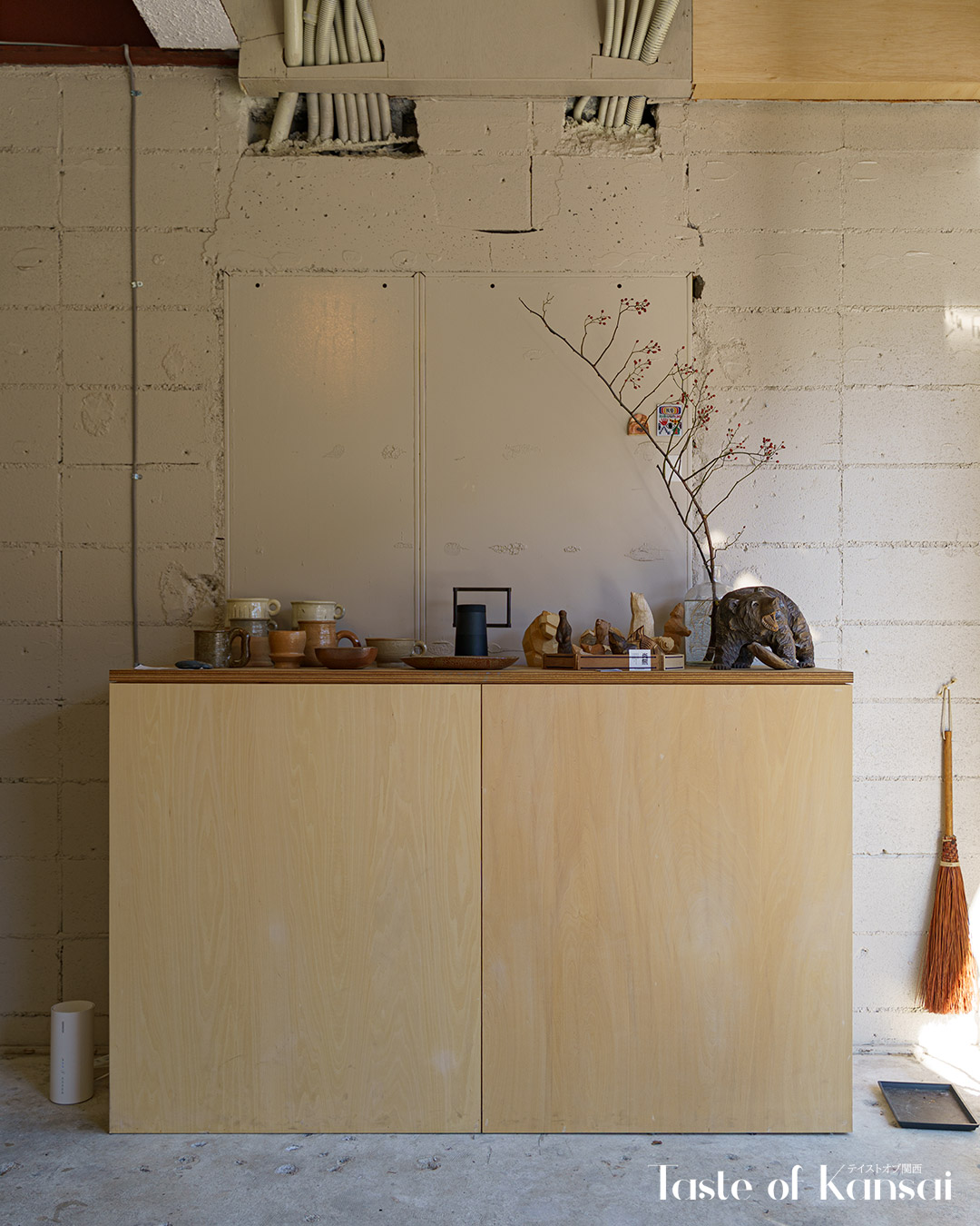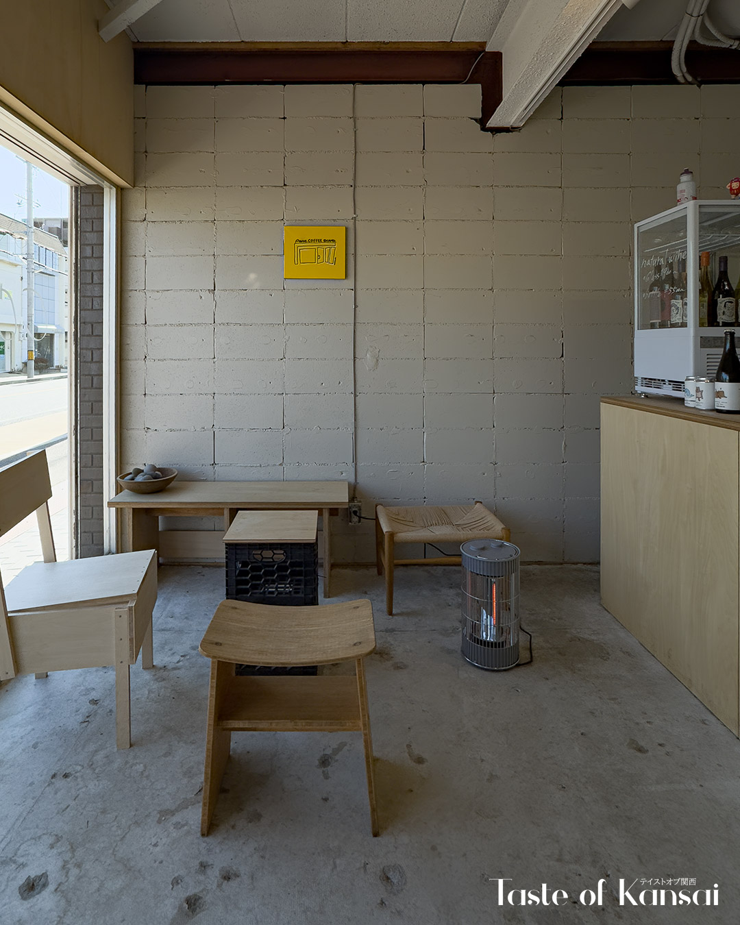 ワークヒルズ武庫之荘という小さなマンションの1階にあり、大きな窓と最小限の看板を備えたシンプルな外観です。店内は清潔でミニマルなデザインで、大きなキッチンカウンターを中心に、陶器やヴィンテージの衣料品を展示した棚や小さなカウンターが配置されています。お客様はコーヒーを待つ間に厳選されたライフスタイルグッズを眺めて楽しむことができます。