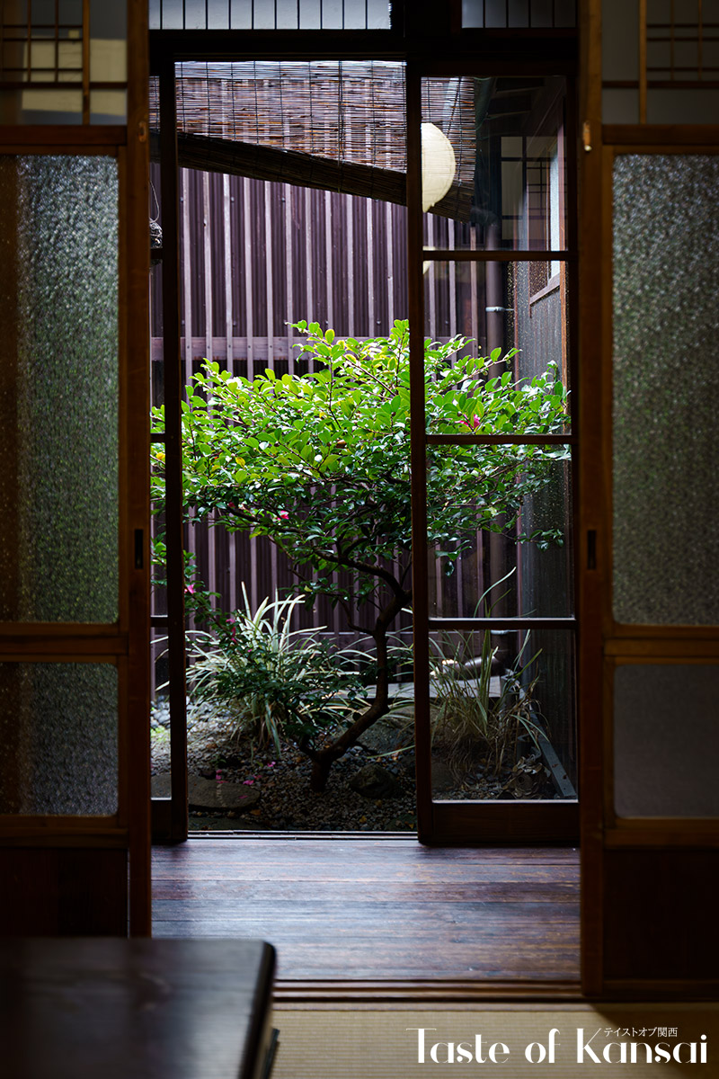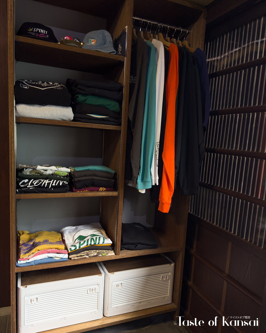 Inside, the interior retains the proportions and exposed timber structure of the original house, pairing these with a restrained contemporary fit-out. The front area functions as the main café space, with the kitchen counter positioned at the entrance and opening onto a generous doma floor. A small corner section is dedicated to Spinit Coffee’s original clothing and goods. Beyond this, the space transitions to a raised tatami-floored washitsu furnished with low tables and zabuton seating. At the very back of the building, a compact tsuboniwa garden provides a quiet visual endpoint, reinforcing the café’s character as a local coffee spot embedded within a historic residential structure.
