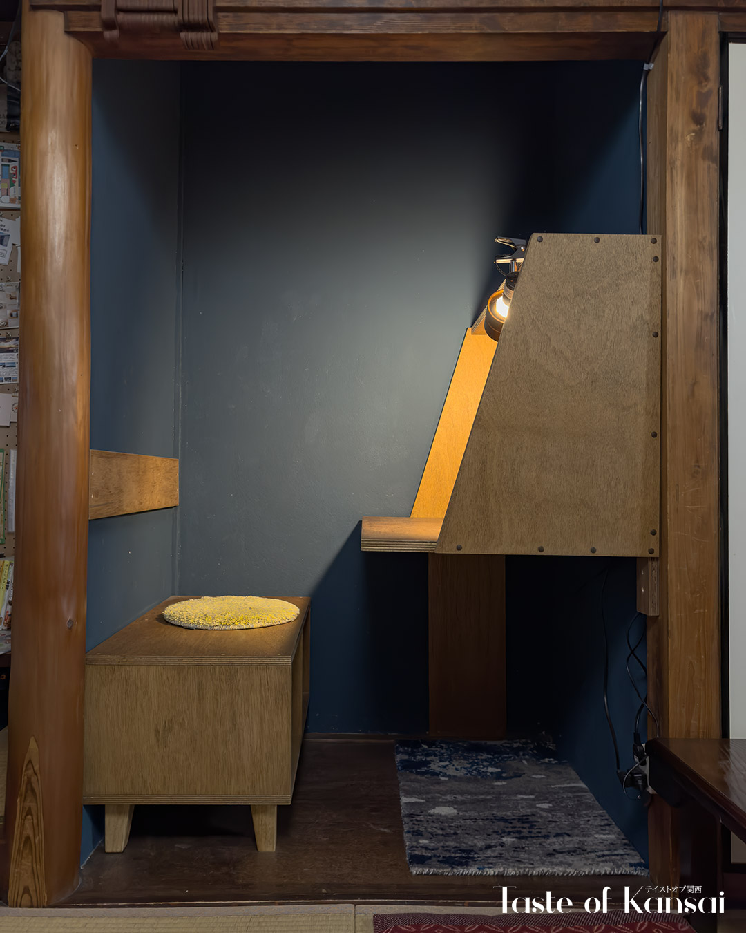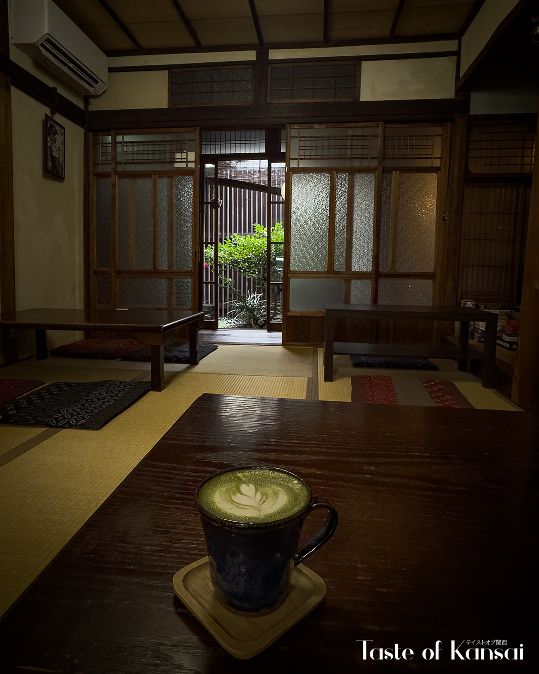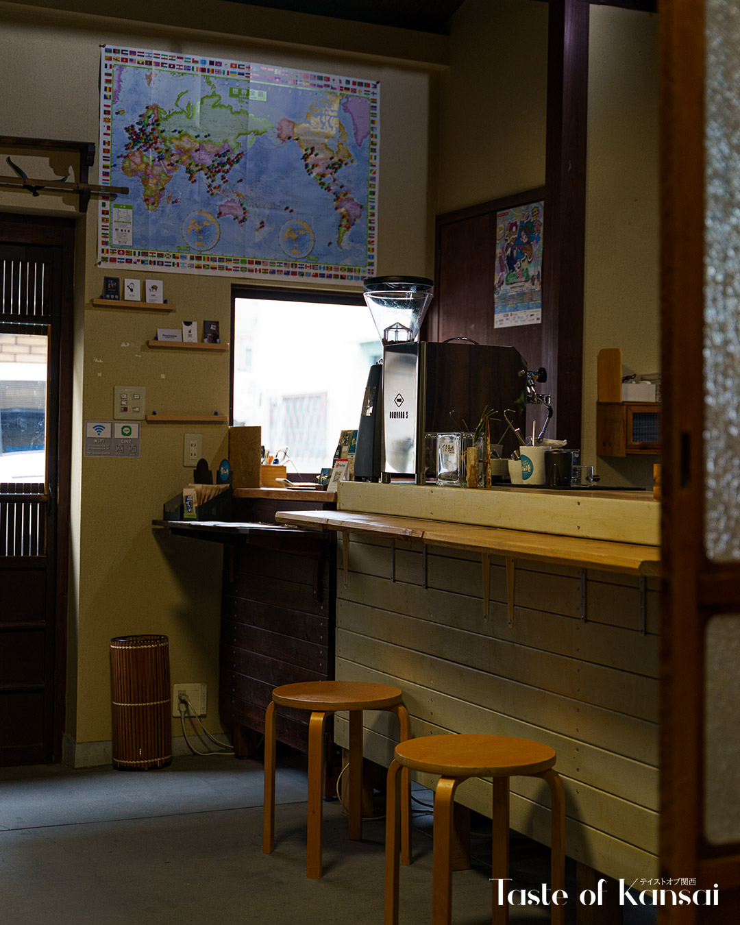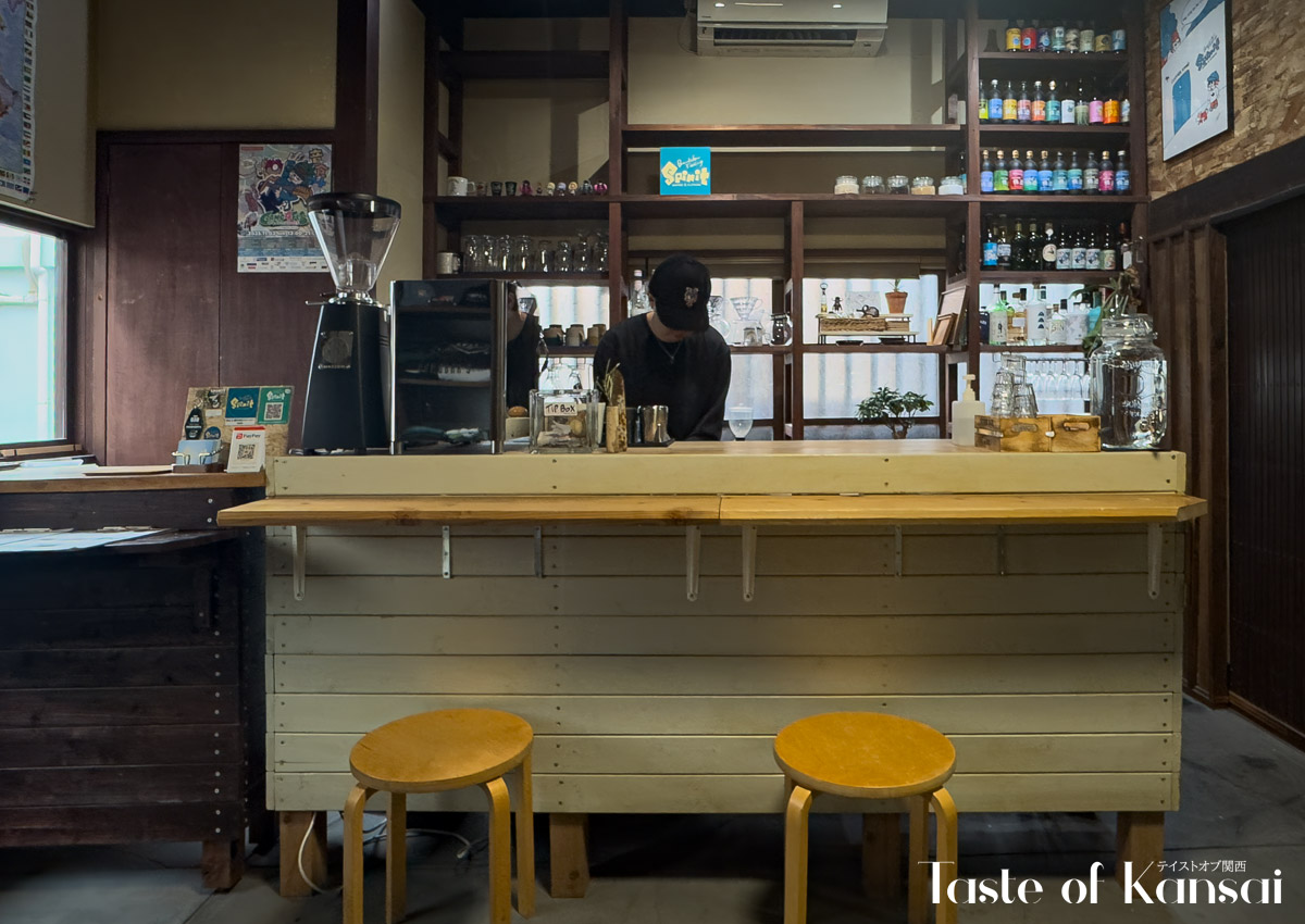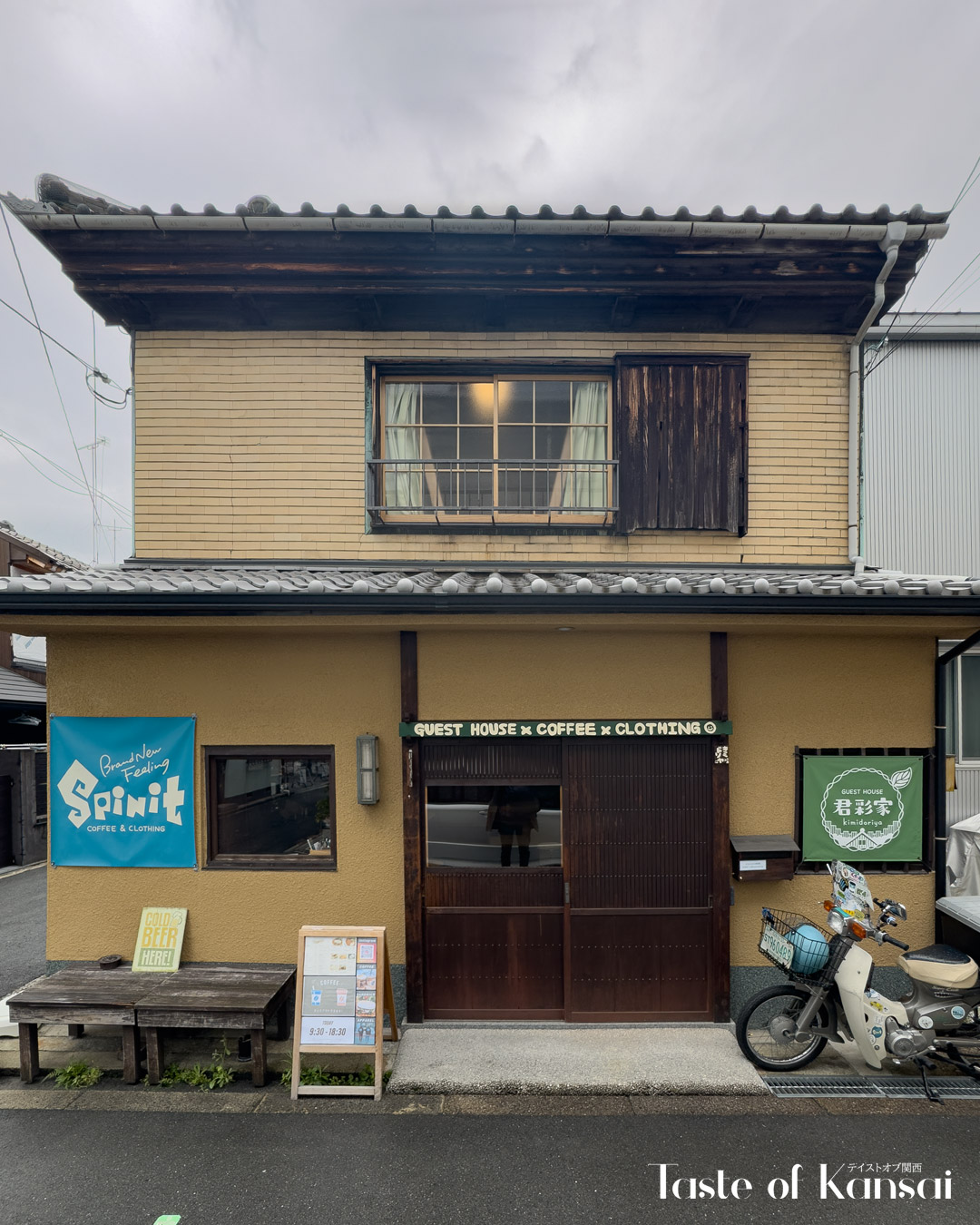 Spinit Coffee (instagram.com/spinit_coffee) is located on a quiet backstreet in Osaka’s Jōtō Ward, about a five-minute walk from Midoribashi Station on the Osaka Metro Chūō Line. Opened in February 2022, the café occupies part of a renovated kominka shared with the Kimidoriya guesthouse. The roughly 90-year-old wooden house retains its original proportions, with a low roofline and narrow frontage facing a residential lane. From the street, the building presents a simple, typical Japanese exterior that blends naturally into its neighbourhood rather than standing out as a commercial space.