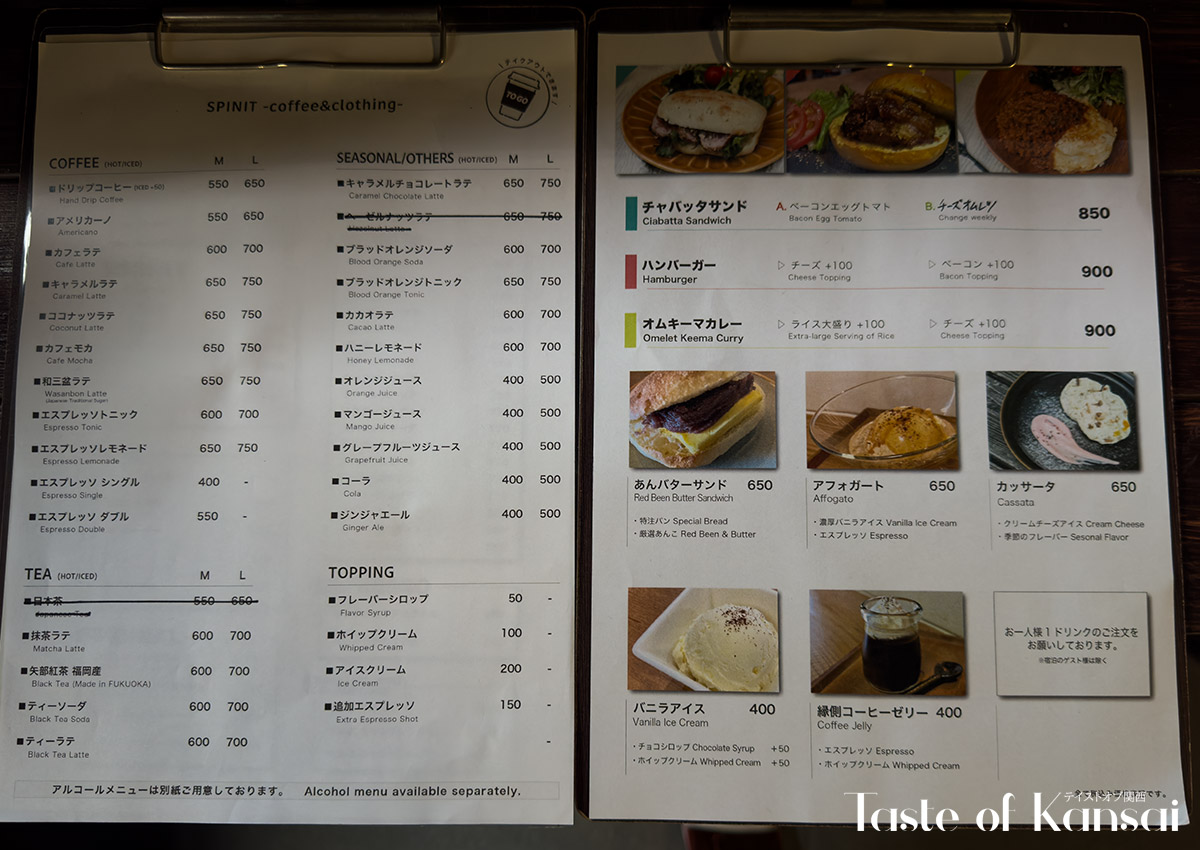 SPINIT -coffee&clothing- offers a well-rounded café menu featuring espresso-based drinks like hand drip coffee, lattes (including distinctive options such as wasanbon and coconut), and espresso tonics, alongside a tea selection highlighting Fukuoka-produced black tea and matcha lattes. Seasonal drinks include blood orange soda, cacao latte, and honey lemonade, with toppings like whipped cream and extra espresso shots available. The food menu centers on hearty items—ciabatta sandwiches with bacon egg tomato or cheese omelette, a hamburger, and omelet keema curry—plus Japanese-style sweets like an anko butter sandwich on specialty bread, affogato, cassata, vanilla ice cream, and coffee jelly. All drinks come in medium and large sizes, and an alcohol menu is available separately.
