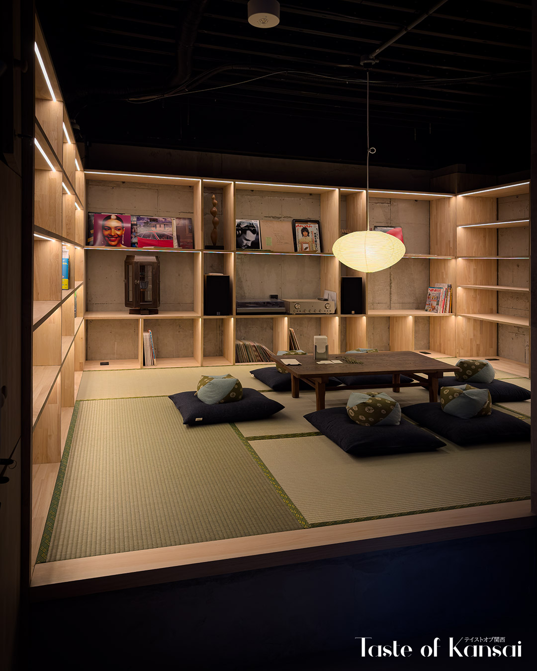 Inside, the layout is divided into two distinct but connected zones. The entrance area is centered around a long concrete counter, where flowers, small goods, and café service coexist. The design combines exposed concrete surfaces, warm wood shelving, and soft pendant lighting, creating a balance between industrial and natural materials. Toward the back, the atmosphere shifts into a more traditional Japanese setting with a raised tatami seating area, low wooden tables, and floor cushions. Built-in shelving lines the walls, displaying books, objects, and vinyl records, adding a residential, lived-in quality to the space. The main attraction is the seamless transition between a working flower shop and a café, with the interior design reinforcing both functions without separating them.