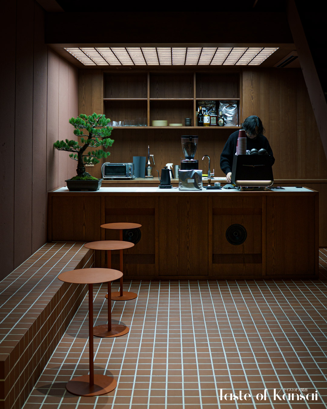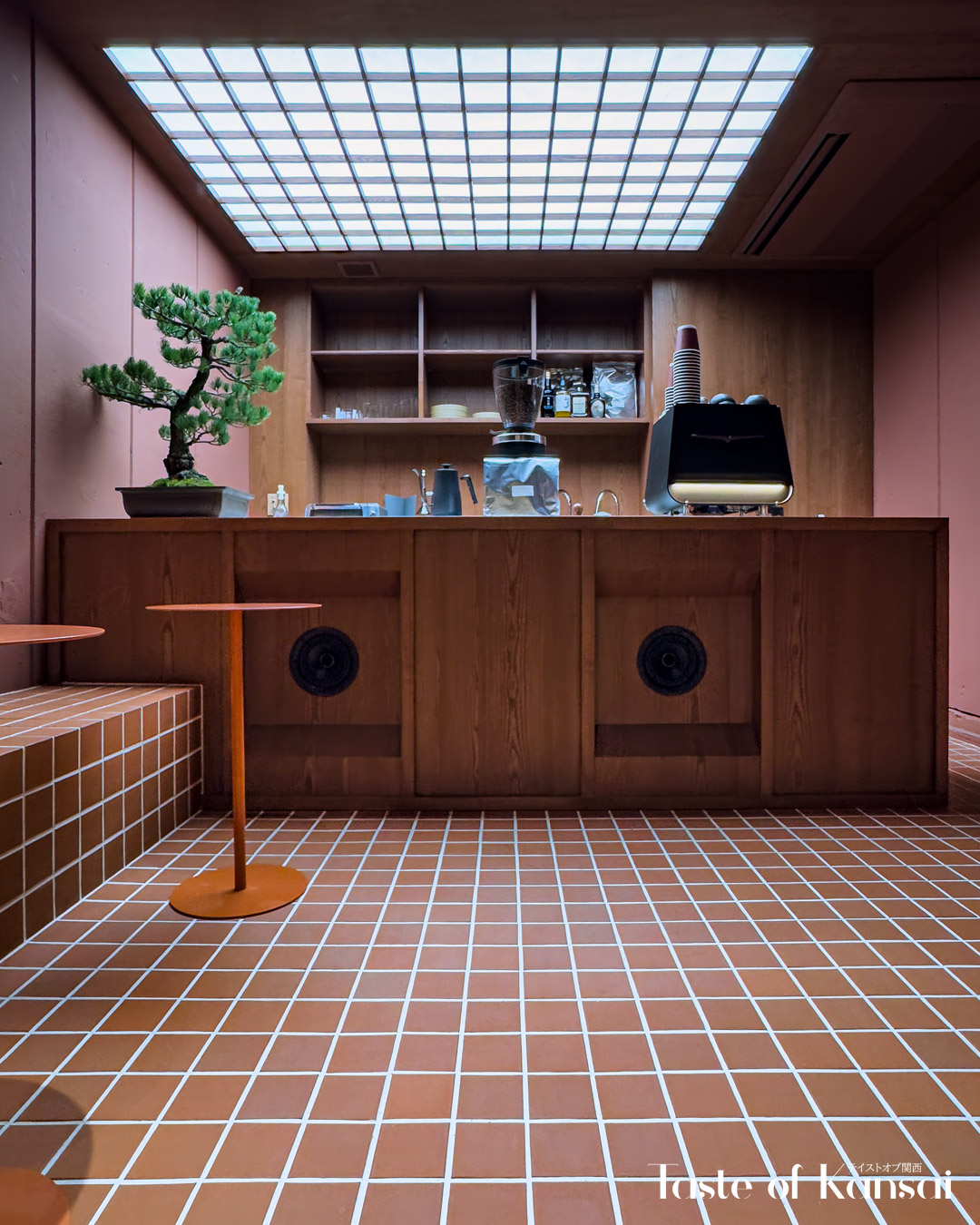 The café occupies a former clothing store that has been carefully renovated by Transform Inc (https://transform-design.co.jp/), resulting in a stylish, modern wa-inspired interior. Roughly the size of a single-car garage, the space feels intimate yet well balanced. A tiled bench lines the left wall with three small tables while a counter sit toward the back. The counter features a cedar-paneled koshikabe with built-in speakers, adding warmth and subtle character. Despite its size, the space feels thoughtfully composed, and it’s also dog-friendly, with water and light snacks provided for canine visitors. Plans are already in place to open a gallery space on the second floor in the future.