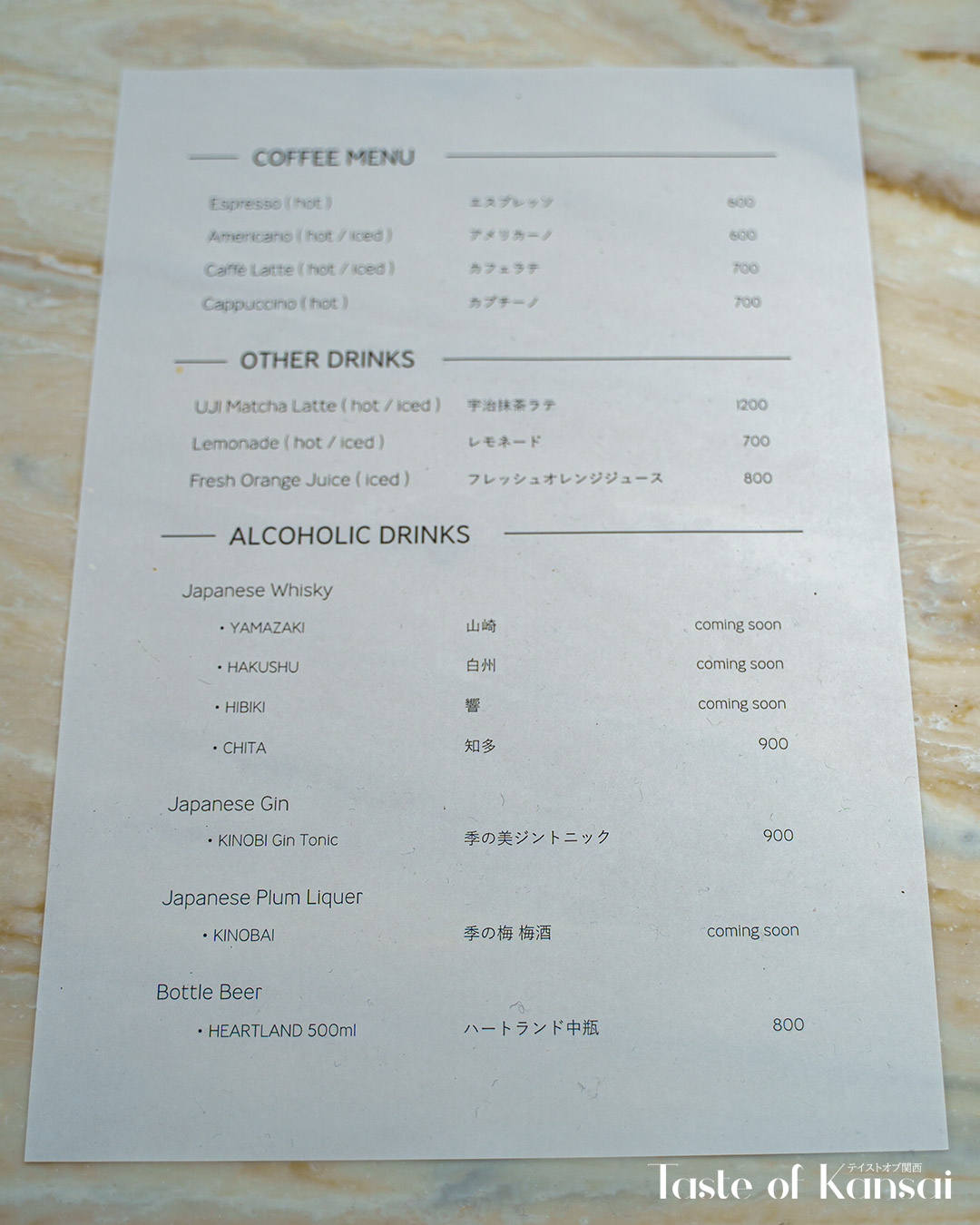 メニューはコーヒーや抹茶、ソフトドリンクなどがあり、コーヒー豆は Ue Coffee のものを使用しています。メニューには、スモークサーモンとクリームチーズ、アボカドとカッテージチーズなどのオープンサンドイッチや、一年を通して変わる季節のフルーツオプションも含まれています。さらに、酒のオプションも提供予定です。