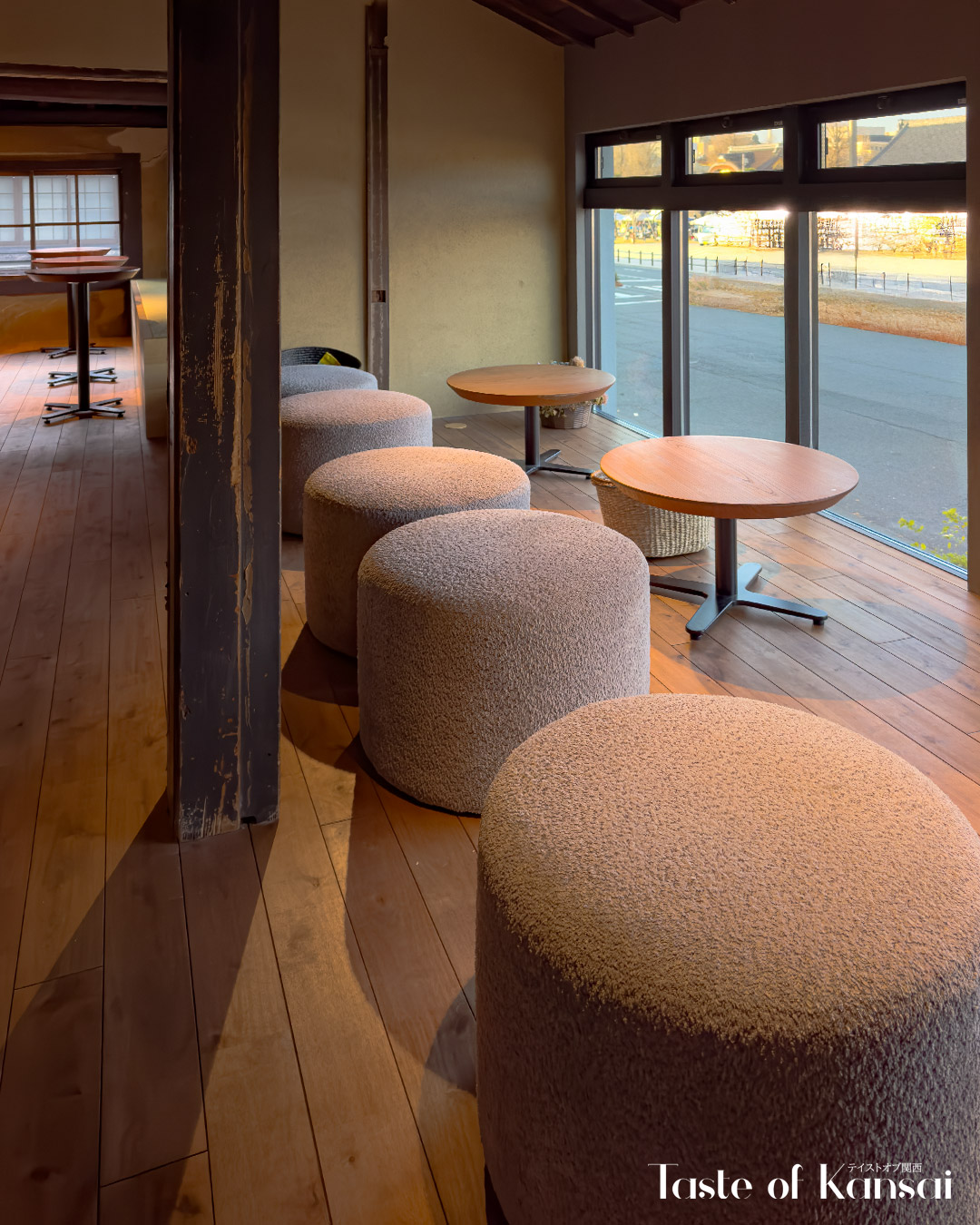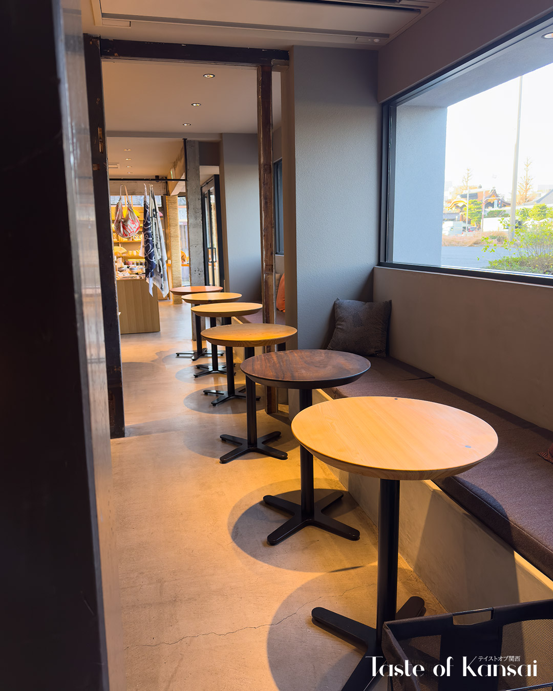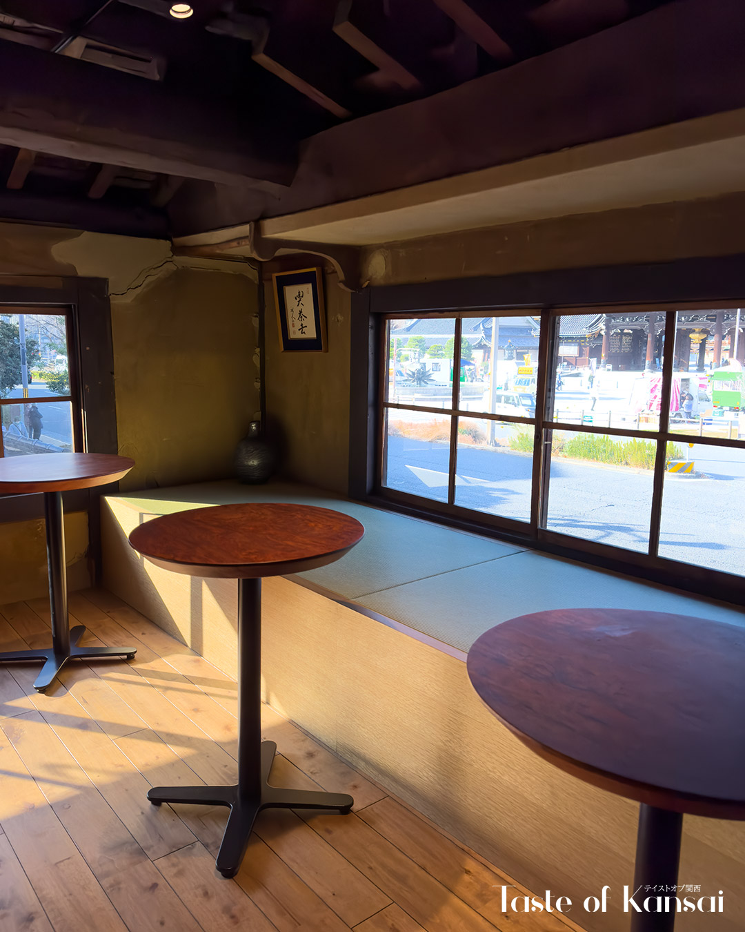 カフェは東本願寺の向かいに位置し、街並みから寺のエリアを眺めることができ、お寺の景色がこのカフェの主な視覚的魅力となっています。