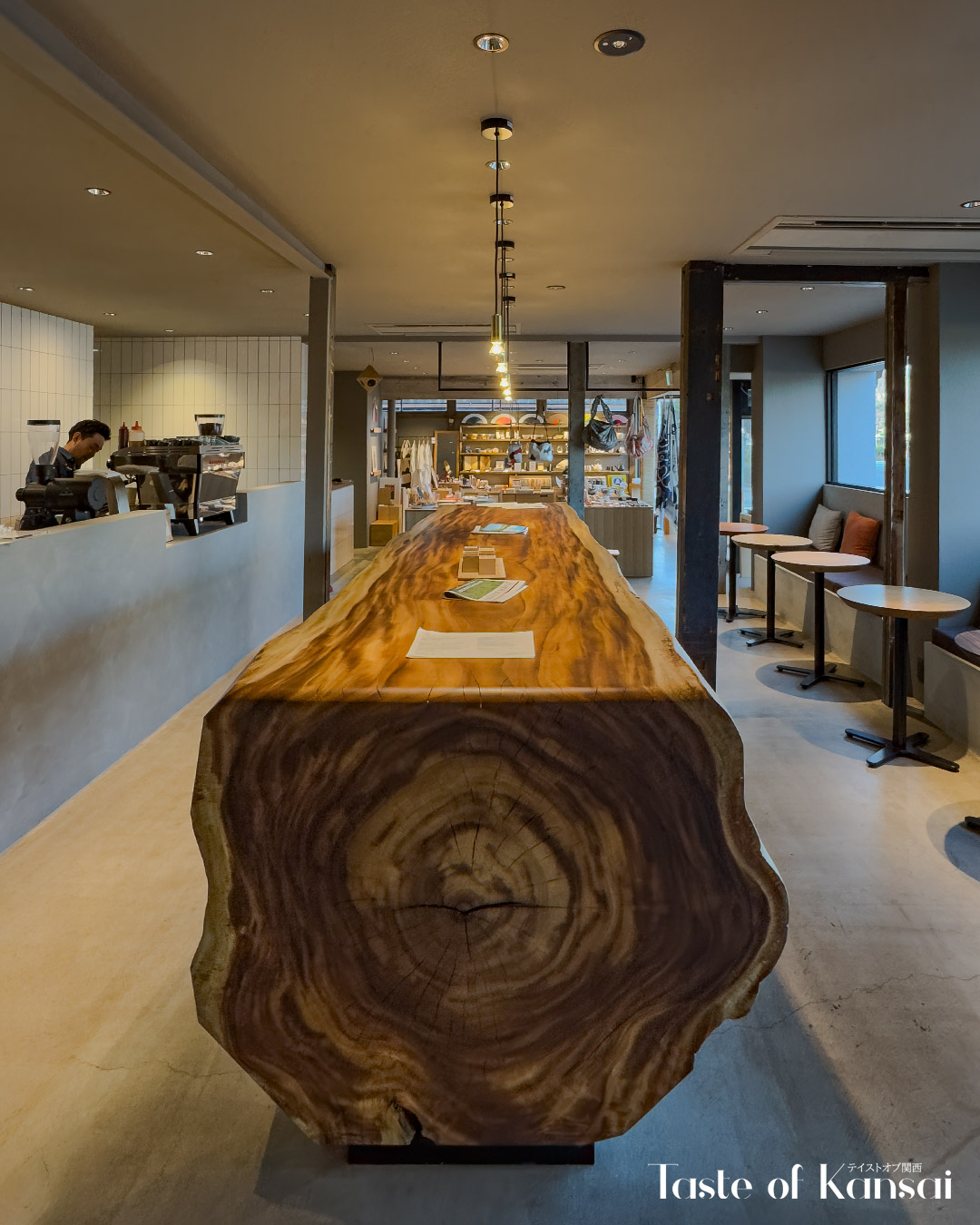 The café is spread across two floors. On the ground level, the kitchen and order counter sit near the entrance, alongside a few tables, a striking communal table carved from a single polished hardwood tree trunk at the center of the space, and window-side seating. A retail area is tucked further to the right.